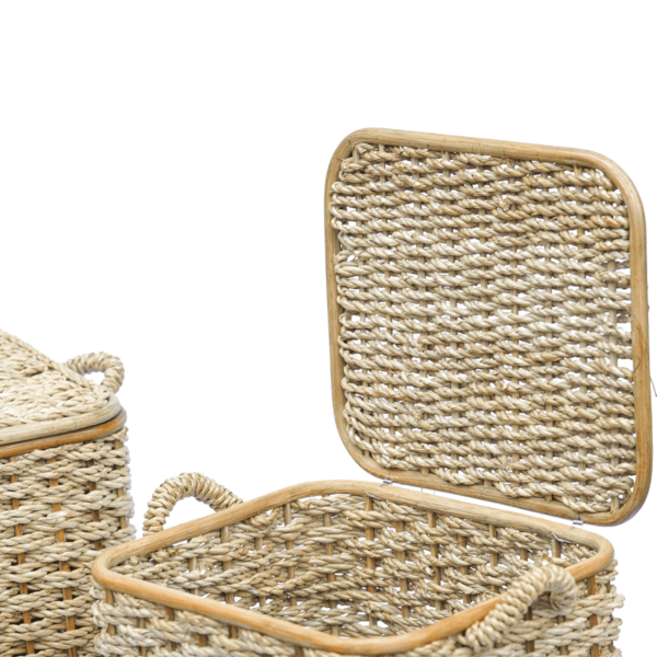 A sturdy, lidded laundry hamper woven from buri palm leaf. Our Ofelia laundry hamper is one of our best sellers and come in two sizes. Each laundry hamper takes up to 2 days to weave by hand, and all can be repurposed around the home as log baskets or toy storage, for example. Our Ofelia laundry hampers are a particularly good size for blankets and throws, slippers and gloves and hats. Our range of ethically produced laundry baskets offer something practical and beautiful for every household – even the largest family!